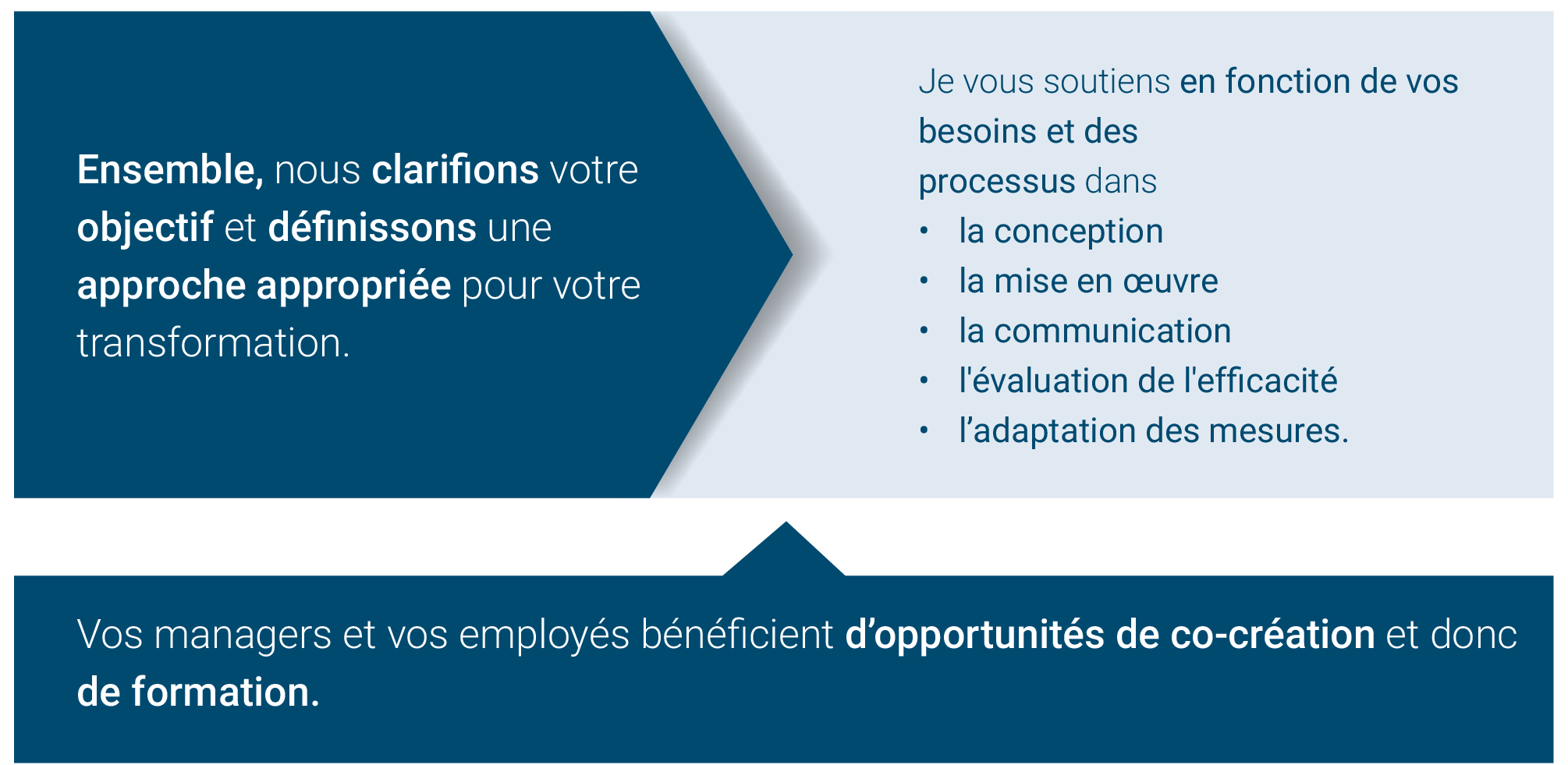 Grâce à la réflexivité et à la flexibilité croissantes des personnes impliquées, vous assurez le succès de votre entreprise à long terme.